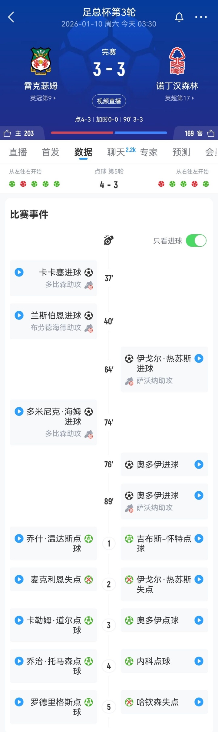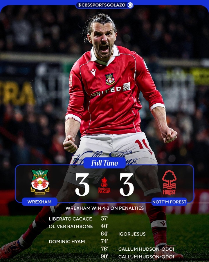 本场比赛,雷克瑟姆一度领先森林2球,但奥多伊的双响将比赛拖入加时赛,最终双方进入点球大战。