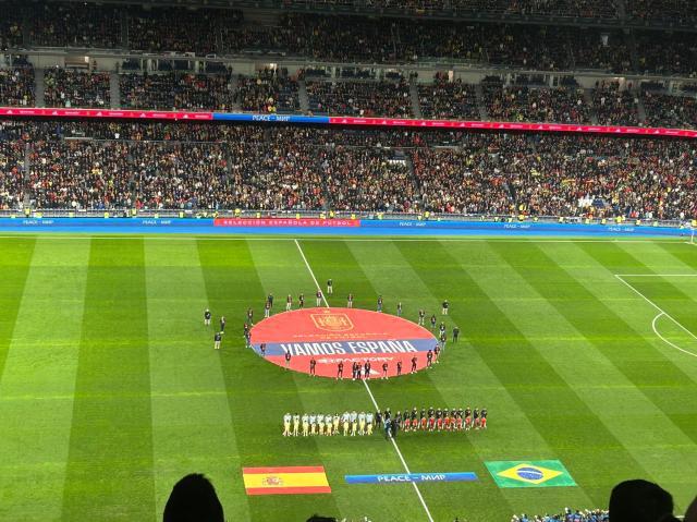时隔四年,西班牙国家队再度在伯纳乌球场作赛,上一次还是2019年欧预赛主场对决瑞典一战,那场比赛西班牙也以一场3比0的大胜回馈了伯纳乌球迷,本场伯纳乌时隔数年再度被西班牙的红色主场球衣装点成一片红。只是天公却不甚作美,比赛这天刚好赶上马德里大风降温,原本已是三月末,气温却堪比隆冬时节。即使伯纳乌顶棚盖了个严丝合缝,球场顶部的暖气也开到了最足,笔者坐在媒体席也是瑟瑟发抖,只能靠着媒体餐里的巧克力慕斯补充热量。